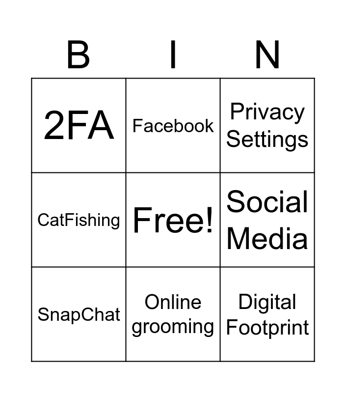 This bingo card has a free space and 15 words: Hacker, Cyberbullying, Privacy Settings, 2FA, Online grooming, Digital Footprint, Phishing, Cyber Security, Social Media, Deepfake, Sexting, CatFishing, SnapChat, Facebook and TikTok.