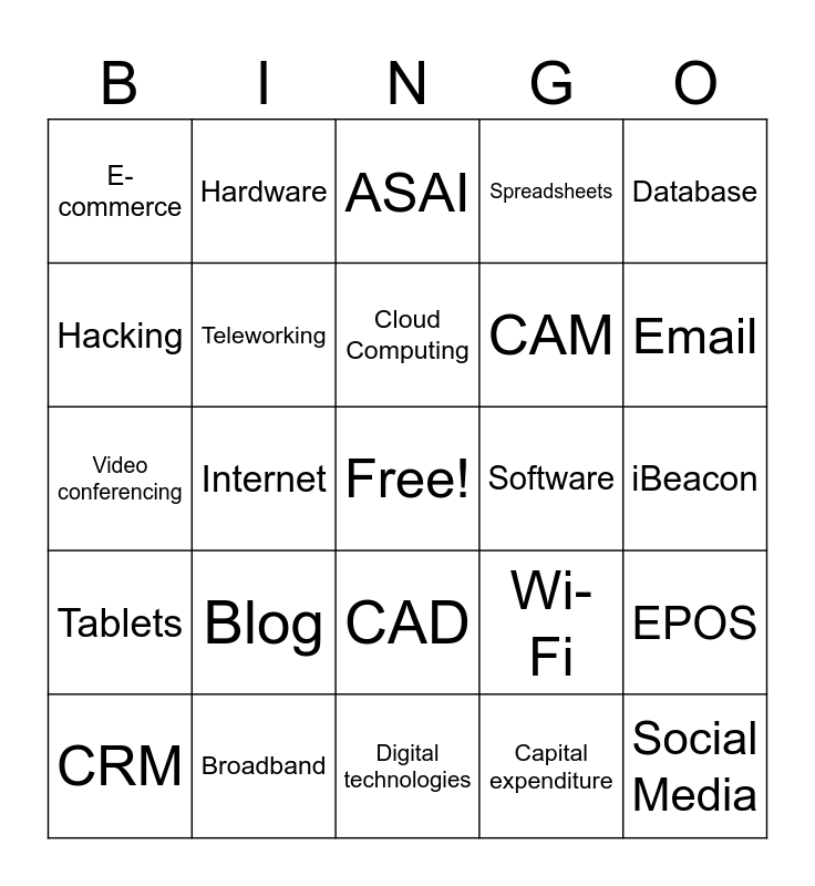 This bingo card has a free space and 24 words: Blog, Broadband, Cloud Computing, CRM, Database, E-commerce, Hacking, Hardware, Software, CAD, CAM, Video conferencing, Wi-Fi, EPOS, Teleworking, Capital expenditure, iBeacon, ASAI, Email, Internet, Social Media, Tablets, Spreadsheets and Digital technologies.
