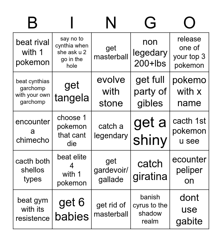 This bingo card has a free space and 24 words: beat elite 4 with 1 pokemon, get 6 babies, evolve with stone, beat gym with its resistence, release one of your top 3 pokemon, beat rival with 1 pokemon, beat cynthias garchomp with your own garchomp, say no to cynthia when she ask u 2 go in the hole, get a shiny, get gardevoir/ gallade, get full party of gibles, encounter a chimecho, catch giratina, ecounter peliper on, get tangela, banish cyrus to the shadow realm, cacth 1st pokemon u see, get masterball, pokemo with x name, choose 1 pokemon that cant die, dont use gabite, cacth both shellos types, non legedary 200+lbs and get rid of masterball.