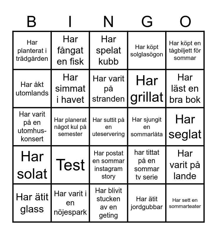 This bingo card has 25 words: Test, Har blivit stucken av en geting, Har varit på stranden, Har ätit glass, Har köpt en tågbiljett för sommar, Har planterat i trädgården, Har åkt utomlands, Har fångat en fisk, Har sjungit en sommarlåta, Har postat en sommar instagram story, Har grillat, Har varit på en utomhus-konsert, har tittat på en sommar tv serie, Har varit på lande, Har simmat i havet, Har sett en sommarteater, Har seglat, Har spelat kubb, Har läst en bra bok, Har planerat något kul på semester, Har suttit på en uteservering, Har varit i en nöjespark, Har solat, Har köpt solglasögon and Har ätit jordgubbar.