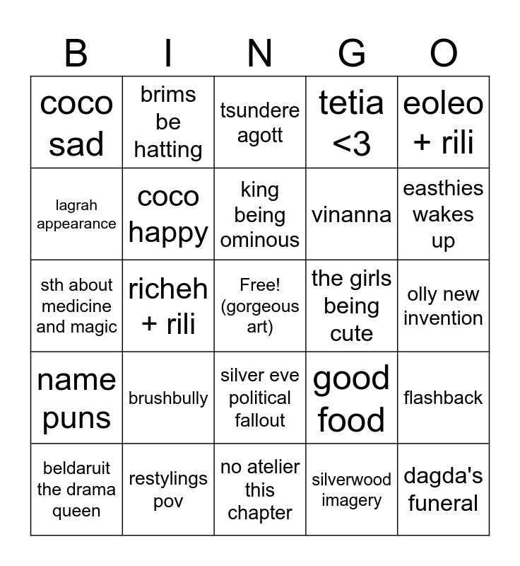 This bingo card has a free space and 24 words: brushbully, restylings pov, king being ominous, beldaruit the drama queen, eoleo + rili, coco sad, lagrah appearance, brims be hatting, the girls being cute, silver eve political fallout, vinanna, sth about medicine and magic, good food, flashback, coco happy, silverwood imagery, olly new invention, tsundere agott, easthies wakes up, richeh + rili, dagda's funeral, name puns, tetia <3 and no atelier this chapter.