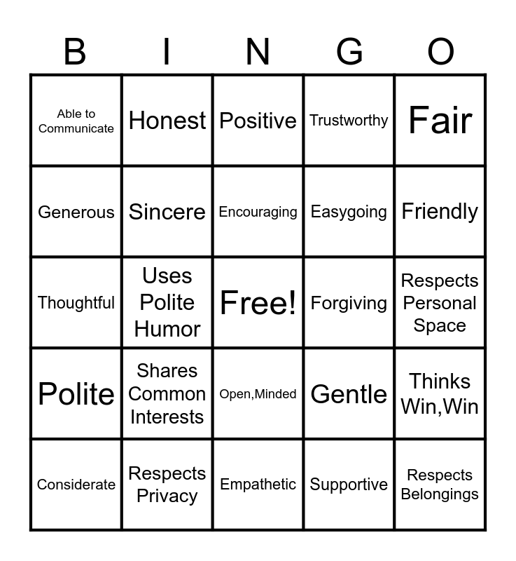 This bingo card has a free space and 36 words: Compassionate, Reliable, Loyal, Sincere, Gentle, Polite, Encouraging, Peaceful, Fair, Helpful, Uses Polite Humor, Trustworthy, Cooperative, Forgiving, Friendly, Able to Communicate, Thankful, Shares Common Interests, Respects Belongings, Positive, Respects Personal Space, Thinks Win,Win, Respects Privacy, Considerate, Empathetic, Honest, Thoughtful, Includes Others, Easygoing, Generous, Kind, Sympathetic, Supportive, Open,Minded, Respectful and Pleasant.
