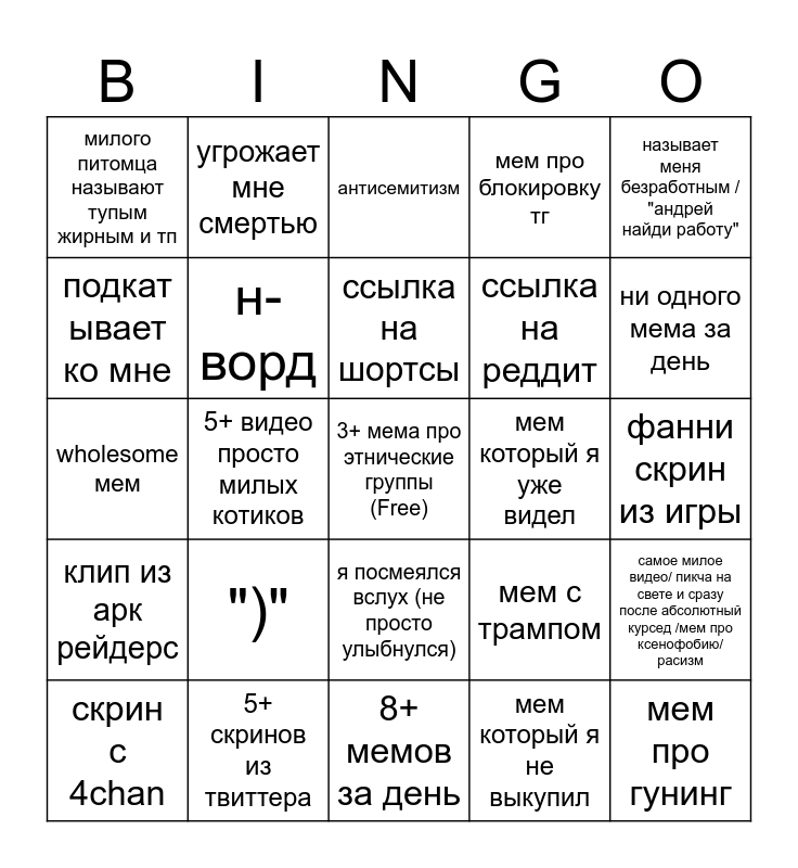 This bingo card has a free space and 24 words: ")", 5+ скринов из твиттера, ссылка на шортсы, скрин с 4chan, называет меня безработным / "андрей найди работу", милого питомца называют тупым жирным и тп, подкат ывает ко мне, угрожает мне смертью, мем который я уже видел, я посмеялся вслух (не просто улыбнулся), ссылка на реддит, wholesome мем, мем с трампом, самое милое видео/ пикча на свете и сразу после абсолютный курсед /мем про ксенофобию/расизм, н-ворд, мем который я не выкупил, фанни скрин из игры, антисемитизм, ни одного мема за день, 5+ видео просто милых котиков, мем про гунинг, клип из арк рейдерс, мем про блокировку тг and 8+ мемов за день.