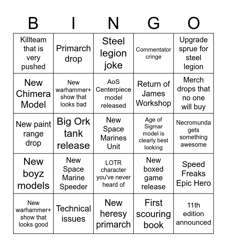 This bingo card has a free space and 24 words: New Space Marine Speeder, Technical issues, AoS Centerpiece model released, New warhammer+ show that looks good, Upgrade sprue for steel legion, Killteam that is very pushed, New Chimera Model, Primarch drop, Age of Sigmar model is clearly best looking, LOTR character you've never heard of, Return of James Workshop, New paint range drop, New boxed game release, Speed Freaks Epic Hero, New warhammer+ show that looks bad, First scouring book, Necromunda gets something awesome, Steel legion joke, Merch drops that no one will buy, Big Ork tank release, 11th edition announced, New boyz models, Commentator cringe and New heresy primarch.
