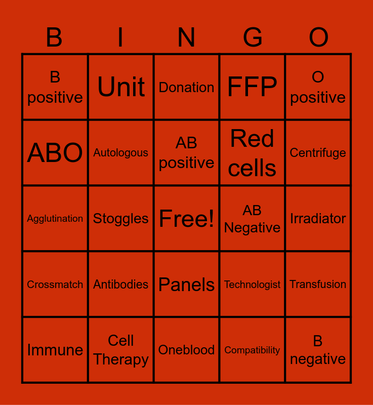 This bingo card has a free space and 60 words: Blood Bank, Cell Therapy, DAT, Crossmatch, Compatibility, Stem cells, Autologous, Directed, Red cells, Platelets, FFP, Cryoprecipitate, ABO, A positive, A negative, B positive, B negative, O positive, O negative, AB positive, AB Negative, Donation, Immune, Transfusion, Test Tubes, Pipettes, Specimens, HLA, Centrifuge, Hemolysis, Dr. Thompson, Dr. Christenson, Dr. Godbey, Dr. Zubair, Unit, Lab Coats, Gloves, Stoggles, Refrigerator, Agglutination, Biohazard, Antibodies, Irradiator, Labels, Technologist, Transplant, Caring Canines, Mayo Clinic, Syringe, Panels, Oneblood, American Red Cross, CAR-T Therapy, Apheresis, Engraftment, Antigens, Lab Week, Hemoglobin, Phenotype and Genotype.