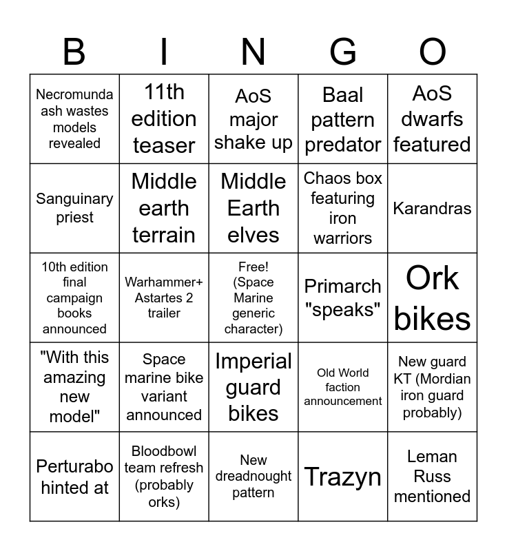 This bingo card has a free space and 24 words: Space marine bike variant announced, Bloodbowl team refresh (probably orks), Middle Earth elves, Perturabo hinted at, AoS dwarfs featured, Necromunda ash wastes models revealed, Sanguinary priest, 11th edition teaser, Primarch "speaks", Imperial guard bikes, Chaos box featuring iron warriors, 10th edition final campaign books announced, Old World faction announcement, New guard KT (Mordian iron guard probably), Middle earth terrain, Trazyn, Ork bikes, AoS major shake up, Karandras, Warhammer+ Astartes 2 trailer, Leman Russ mentioned, "With this amazing new model", Baal pattern predator and New dreadnought pattern.