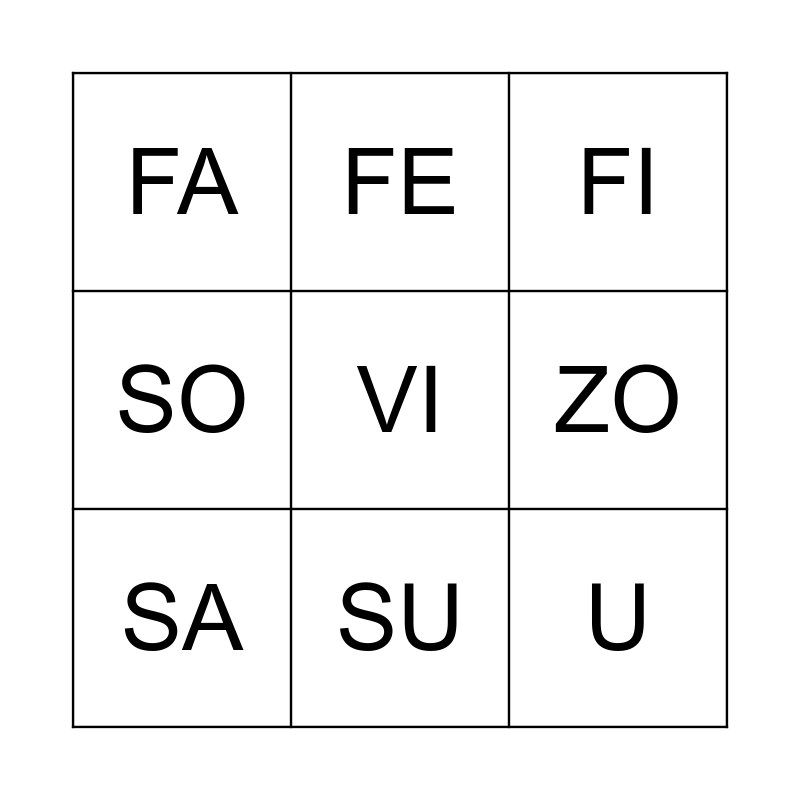 This bingo card has a free space and 24 words: A, E, I, O, U, FA, FE, FI, FO, FU, VA, VE, VO, VU, SA, SE, SI, SO, SU, ZA, ZE, ZI, ZO and ZU.