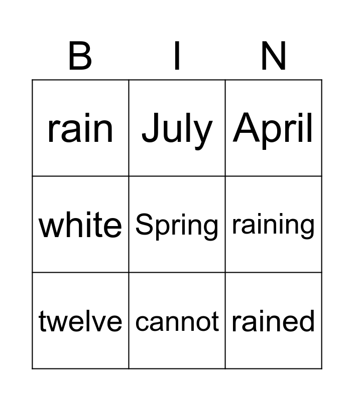 This bingo card has a free space and 9 words: twelve, April, July, white, rain, raining, rained, can't and cannot.