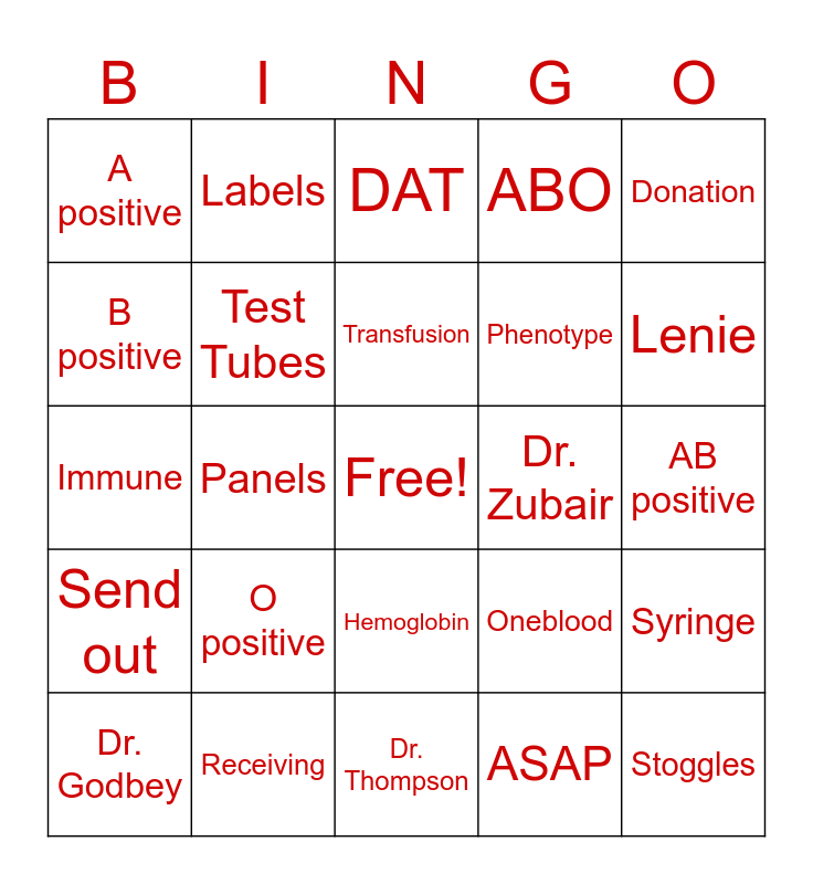This bingo card has a free space and 80 words: Blood Bank, Cell Therapy, DAT, Crossmatch, Compatibility, Stem cells, Autologous, Directed, Red cells, Platelets, FFP, Cryoprecipitate, ABO, A positive, A negative, B positive, B negative, O positive, O negative, AB positive, AB Negative, Donation, Immune, Transfusion, Test Tubes, Pipettes, Specimens, HLA, Centrifuge, Hemolysis, Lenie, Karafa, Dr. Thompson, Dr. Christenson, Dr. Godbey, Dr. Zubair, Unit, Lab Coats, Gloves, Stoggles, Refrigerator, Agglutination, Biohazard, Antibodies, Irradiator, Labels, Technologist, Transplant, Caring Canines, Mayo Clinic, Syringe, Panels, Oneblood, American Red Cross, CAR-T Therapy, Apheresis, Engraftment, Antigens, Lab Week, Hemoglobin, Phenotype, Genotype, Duffy, Kidd, Kell, Cell Washer, Incubate, Thawer, Softbank, SoftLab, Send out, Receiving, Teamwork, Heroes, Recipient, STAT, ASAP, Routine, Results and SOP.