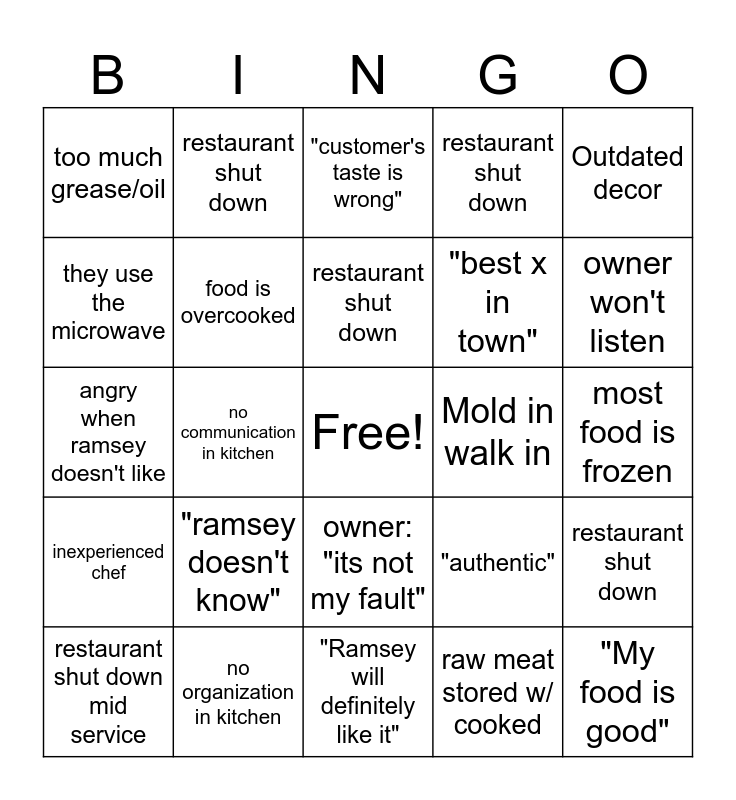 This bingo card has a free space and 29 words: restaurant shut down mid service, Food is bland, no communication in kitchen, “We've always served it like that”, too much grease/oil, "customer's taste is wrong", food is overcooked, "ramsey doesn't know", Mold in walk in, no organization in kitchen, most food is frozen, "My food is good", "Ramsey will definitely like it", raw meat stored w/ cooked, owner won't listen, kitchen is dirty, owner: "its not my fault", inexperienced chef, Outdated decor, angry when ramsey doesn't like, "authentic", food is raw, "best x in town", they use the microwave, restaurant shut down, restaurant shut down, restaurant shut down, restaurant shut down and restaurant shut down.