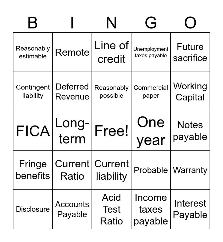 This bingo card has a free space and 25 words: Current Ratio, Acid Test Ratio, Reasonably possible, Disclosure, Future sacrifice, Reasonably estimable, Contingent liability, Remote, One year, Current liability, Commercial paper, FICA, Probable, Warranty, Deferred Revenue, Sales tax, Notes payable, Line of credit, Working Capital, Long-term, Interest Payable, Accounts Payable, Fringe benefits, Unemployment taxes payable and Income taxes payable.
