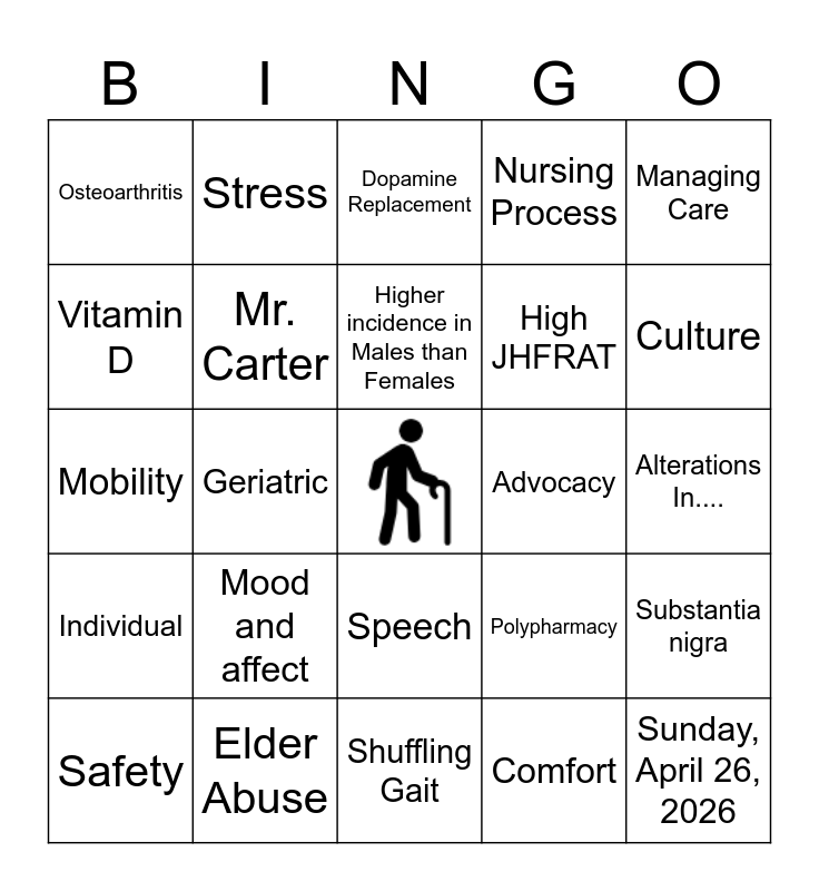 This bingo card has a free space and 34 words: Cognition, Comfort, Family, Health Promotion, Individual, Mr. Carter, Managing Care, Safety, Stress, Coping, Higher incidence in Males than Females, Dopamine Replacement, Environment, Nutrition, Advocacy, Culture, Elder Abuse, Mobility, Mood and affect, Polypharmacy, Speech, Home Safety, Osteoarthritis, Alterations In...., Shuffling Gait, Sunday, April 26, 2026, Nursing Process, Walker, Cane, Gait Belt, High JHFRAT, Vitamin D, Tremor, Geriatric, Substantia nigra and Dopamine Deficiency.