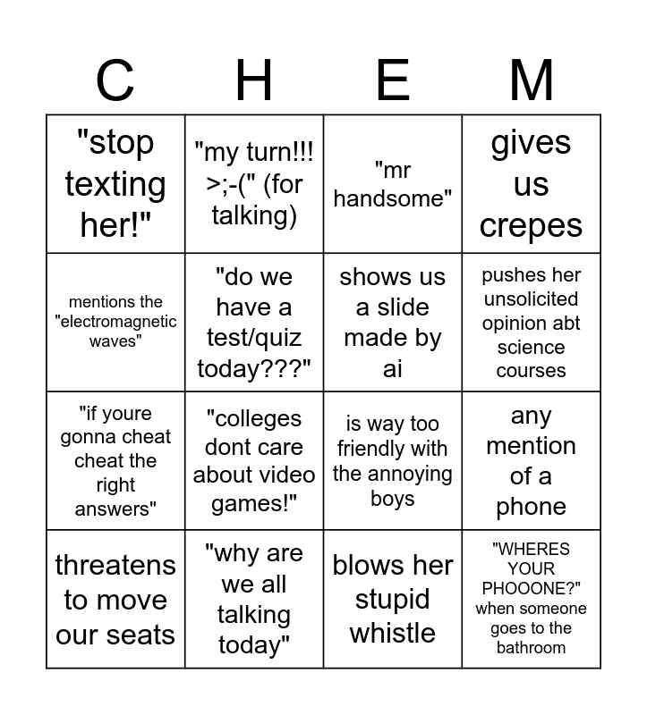 This bingo card has 16 words: "why are we all talking today", any mention of a phone, "mr handsome", "stop texting her!", "if youre gonna cheat cheat the right answers", "my turn!!! >;-(" (for talking), is way too friendly with the annoying boys, blows her stupid whistle, mentions the "electromagnetic waves", "do we have a test/quiz today???", threatens to move our seats, gives us crepes, "colleges dont care about video games!", pushes her unsolicited opinion abt science courses, shows us a slide made by ai and "WHERES YOUR PHOOONE?" when someone goes to the bathroom.
