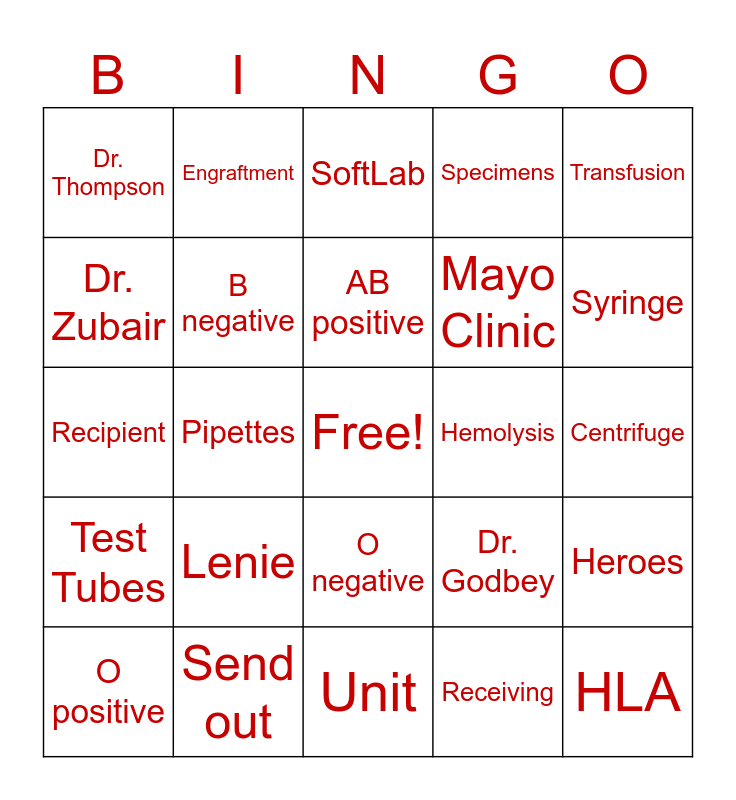 This bingo card has a free space and 39 words: A positive, A negative, B positive, B negative, O positive, O negative, AB positive, AB Negative, Transfusion, Test Tubes, Pipettes, Specimens, HLA, Centrifuge, Hemolysis, Lenie, Karafa, Dr. Thompson, Dr. Christenson, Dr. Godbey, Dr. Zubair, Unit, Mayo Clinic, Syringe, Panels, Oneblood, American Red Cross, CAR-T Therapy, Apheresis, Engraftment, Antigens, Softbank, SoftLab, Send out, Receiving, Teamwork, Heroes, Recipient and STAT.
