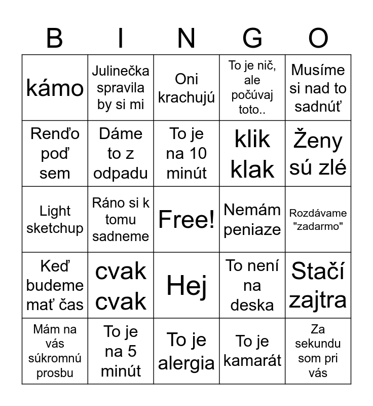 This bingo card has a free space and 24 words: cvak cvak, To je na 5 minút, To je na 10 minút, Mám na vás súkromnú prosbu, Musíme si nad to sadnúť, kámo, Renďo poď sem, Julinečka spravila by si mi, Nemám peniaze, Hej, klik klak, Light sketchup, To není na deska, Stačí zajtra, Dáme to z odpadu, To je kamarát, Rozdávame "zadarmo", Oni krachujú, Ženy sú zlé, Ráno si k tomu sadneme, Za sekundu som pri vás, Keď budeme mať čas, To je nič, ale počúvaj toto.. and To je alergia.