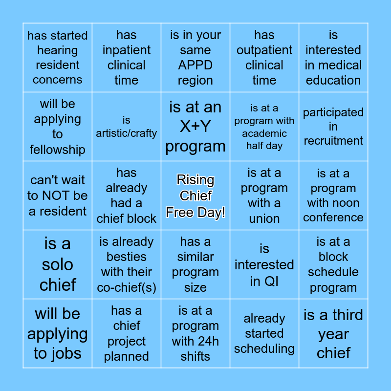 This bingo card has a free space and 26 words: has a similar program size, already started scheduling, is at an X+Y program, has a chief project planned, is interested in medical education, has started hearing resident concerns, will be applying to fellowship, has inpatient clinical time, is at a program with noon conference, is interested in QI, is at a program with academic half day, can't wait to NOT be a resident, is at a block schedule program, will be applying to jobs, has already had a chief block, has started calling their PD by their first name, has outpatient clinical time, is a solo chief, is in your same APPD region, is a third year chief, participated in recruitment, is at a program with 24h shifts, is at a program with a union, is already besties with their co-chief(s), is artistic/crafty and is good with technology.