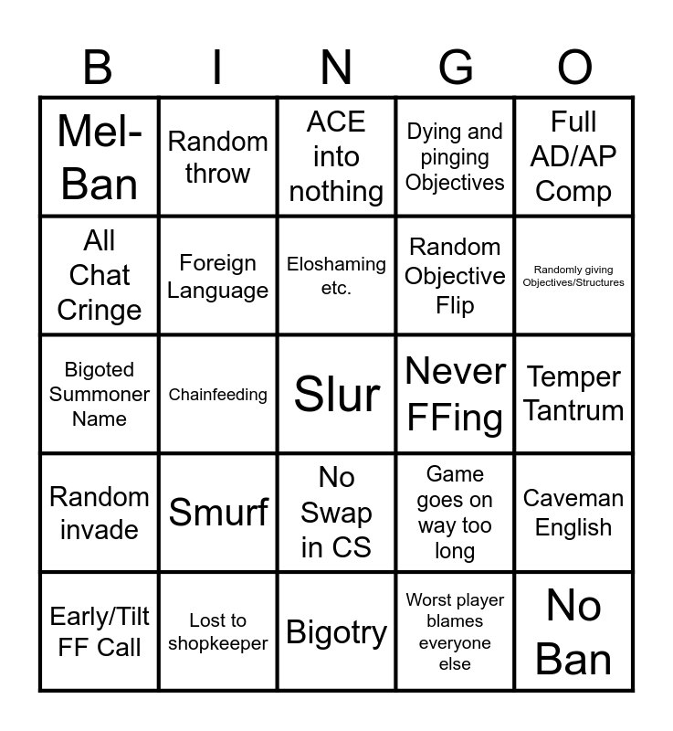 This bingo card has 25 words: Smurf, Bigotry, Eloshaming etc., Early/Tilt FF Call, Full AD/AP Comp, Mel-Ban, All Chat Cringe, Random throw, Never FFing, No Swap in CS, Random Objective Flip, Bigoted Summoner Name, Game goes on way too long, Caveman English, Foreign Language, No Ban, Temper Tantrum, ACE into nothing, Randomly giving Objectives/Structures, Chainfeeding, Slur, Lost to shopkeeper, Random invade, Dying and pinging Objectives and Worst player blames everyone else.