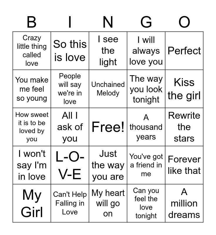 This bingo card has a free space and 24 words: L-O-V-E, Can't Help Falling in Love, Unchained Melody, My Girl, Perfect, Crazy little thing called love, You make me feel so young, So this is love, A thousand years, Just the way you are, The way you look tonight, How sweet it is to be loved by you, You've got a friend in me, Forever like that, People will say we're in love, Can you feel the love tonight, Rewrite the stars, I see the light, Kiss the girl, All I ask of you, A million dreams, I won't say I'm in love, I will always love you and My heart will go on.