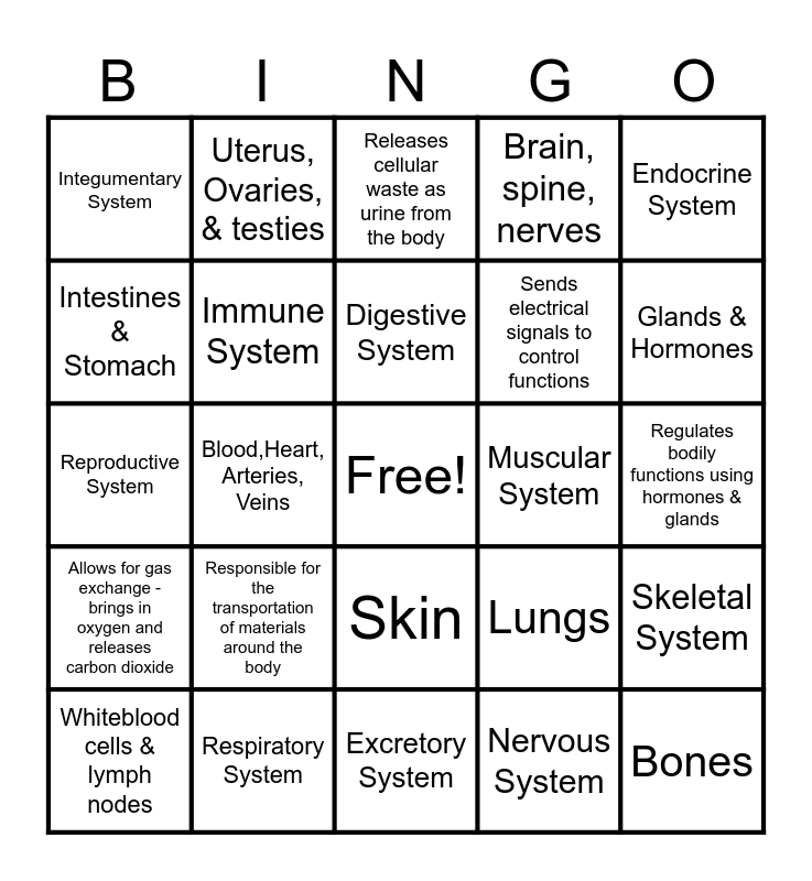 This bingo card has a free space and 28 words: Circulatory System, Respiratory System, Digestive System, Nervous System, Endocrine System, Integumentary System, Immune System, Excretory System, Muscular System, Skeletal System, Reproductive System, Blood,Heart, Arteries, Veins, Lungs, Bones, Intestines & Stomach, Bladder, Kidneys, urethra, Skin, Brain, spine, nerves, Glands & Hormones, Whiteblood cells & lymph nodes, Uterus, Ovaries, & testies, Urine/Pee, Sends electrical signals to control functions, Regulates bodily functions using hormones & glands, Allows for gas exchange -brings in oxygen and releases carbon dioxide, Responsible for the transportation of materials around the body, Releases cellular waste as urine from the body and Fights and defends the body from outside pathogens such as bacteria and viruses.