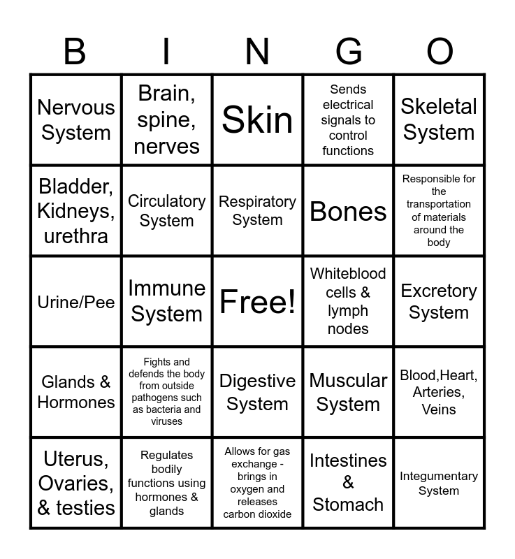 This bingo card has a free space and 28 words: Blood,Heart, Arteries, Veins, Lungs, Bones, Intestines & Stomach, Bladder, Kidneys, urethra, Skin, Brain, spine, nerves, Glands & Hormones, Whiteblood cells & lymph nodes, Uterus, Ovaries, & testies, Urine/Pee, Sends electrical signals to control functions, Regulates bodily functions using hormones & glands, Allows for gas exchange -brings in oxygen and releases carbon dioxide, Responsible for the transportation of materials around the body, Releases cellular waste as urine from the body, Fights and defends the body from outside pathogens such as bacteria and viruses, Circulatory System, Respiratory System, Digestive System, Nervous System, Endocrine System, Integumentary System, Immune System, Excretory System, Muscular System, Skeletal System and Reproductive System.