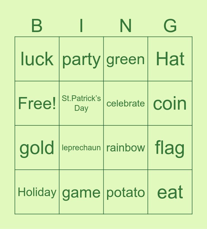 This bingo card has 16 words: game, flag, green, luck, gold, party, rainbow, potato, Free!, St.Patrick’s Day, Holiday, Hat, leprechaun, coin, celebrate and eat.