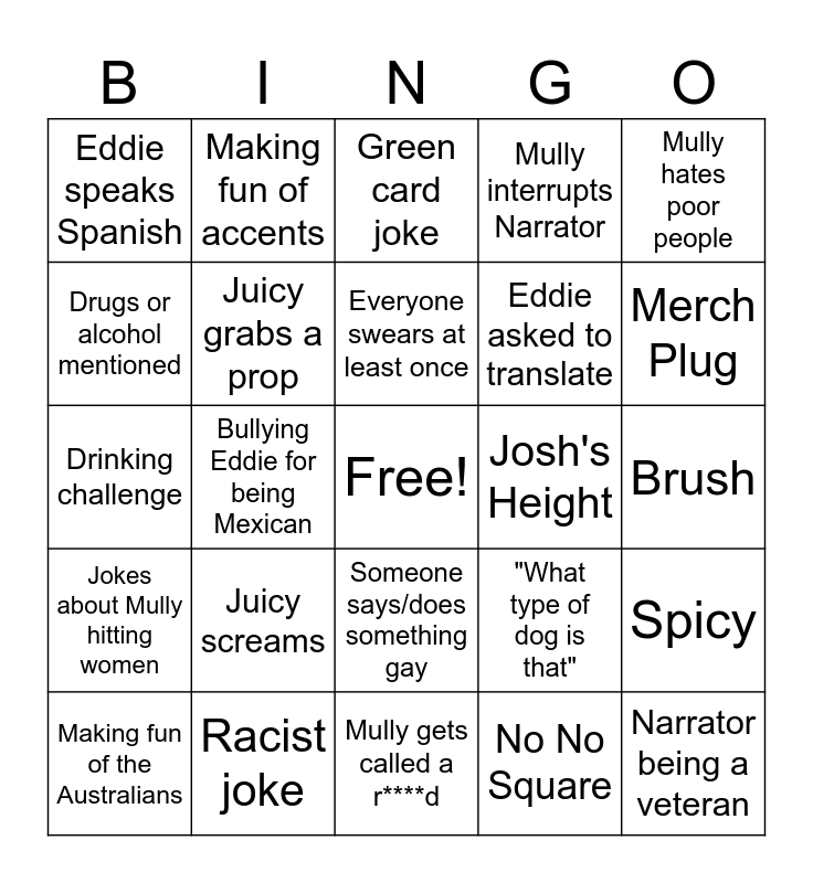 This bingo card has a free space and 39 words: Narrator doing voices, The Make a Wish incident, Any pet named or shown, Juicy grabs a prop, Making fun of the Australians, Someone says/does something gay, Everyone swears at least once, Juicy being Juicy, Mully hates poor people, Jokes about Mully hitting women, Bullying Eddie for being Mexican, Mully interrupts Narrator, Narrator being a veteran, Brush, Josh's Height, Juicy screams, Making fun of the Americans, Eddie speaks Spanish, Someone else makes an appearance, "What type of dog is that", Drugs or alcohol mentioned, Mully gets called a r****d, Eddie asked to translate, Merch Plug, Not all Boys in video, Josh = Golem, Narrator makes a pun, Extremely offensive comment, The crew gets bullied, Making fun of accents, Some/All Boys together, Mully makes fun of the disabled, Green card joke, Racist joke, No No Square, Sponsored video, Spicy, Drinking challenge and Non Main channel video.