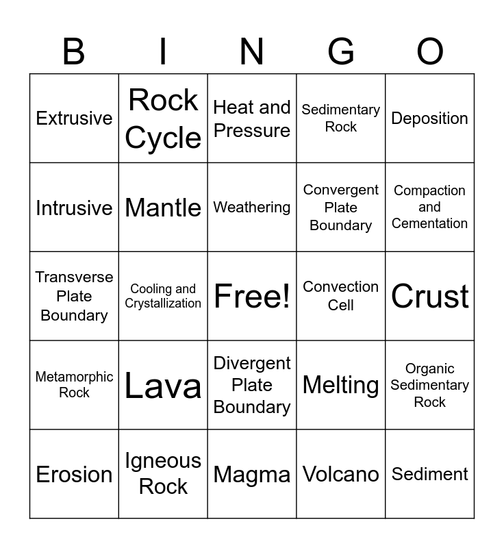 This bingo card has a free space and 25 words: Lava, Magma, Weathering, Erosion, Deposition, Extrusive, Intrusive, Rock Cycle, Convection Cell, Divergent Plate Boundary, Convergent Plate Boundary, Transverse Plate Boundary, Melting, Organic Sedimentary Rock, Mantle, Core, Crust, Heat and Pressure, Compaction and Cementation, Cooling and Crystallization, Sediment, Igneous Rock, Metamorphic Rock, Sedimentary Rock and Volcano.