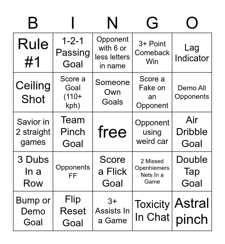 This bingo card has a free space and 24 words: Opponents FF, Flip Reset Goal, Someone Own Goals, Bump or Demo Goal, Lag Indicator, Rule #1, Ceiling Shot, 1-2-1 Passing Goal, Opponent using weird car, Score a Flick Goal, Score a Fake on an Opponent, Savior in 2 straight games, 2 Missed Openhiemers Nets In a Game, Double Tap Goal, Score a Goal (110+ kph), Toxicity In Chat, Air Dribble Goal, Opponent with 6 or less letters in name, Demo All Opponents, Team Pinch Goal, Astral pinch, 3 Dubs In a Row, 3+ Point Comeback Win and 3+ Assists In a Game.