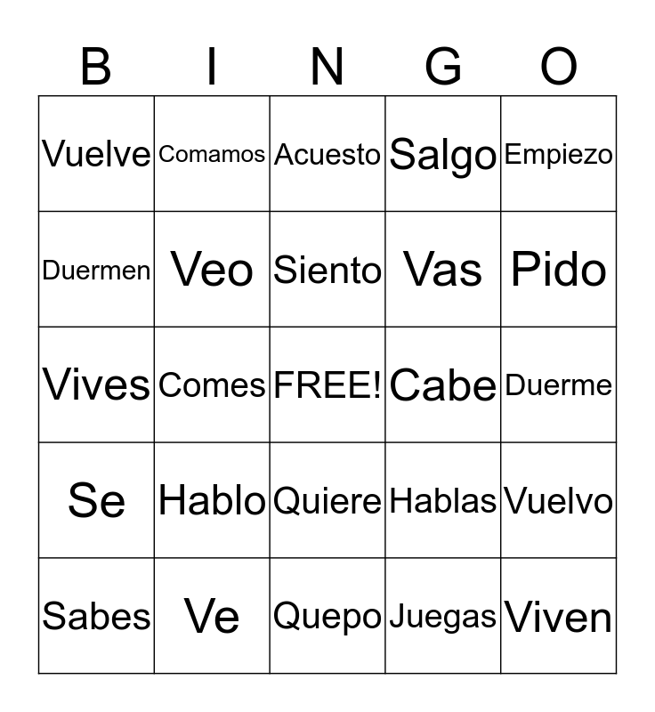 This bingo card has a free space and 42 words: Como, Siento, Conozco, Hablo, Juegas, Vuelvo, Viven, Caigo, Acuesto, Quiere, Duerme, Pido, Comes, Empiezo, Juego, Hablas, Digo, Vives, Quiero, Comamos, Duermen, Vengo, Pides, Vuelve, Estoy, Eres, Vas, Soy, Estan, Va, Doy, Se, Veo, Quepo, Da, Sabes, Ve, Cabe, Traigo, Tengo, Salgo and Pongo.