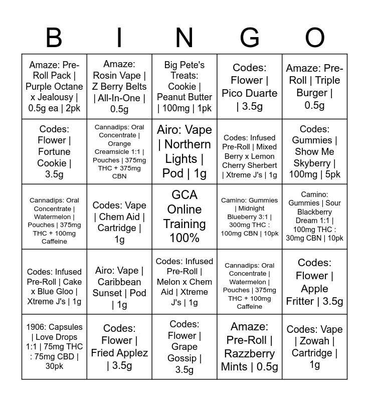 This bingo card has a free space and 24 words: 1906: Capsules | Love Drops 1:1 | 75mg THC : 75mg CBD | 30pk, Airo: Vape | Caribbean Sunset | Pod | 1g, Airo: Vape | Northern Lights | Pod | 1g, Amaze: Pre-Roll | Razzberry Mints | 0.5g, Amaze: Pre-Roll | Triple Burger | 0.5g, Amaze: Pre-Roll Pack | Purple Octane x Jealousy | 0.5g ea | 2pk, Amaze: Rosin Vape | Z Berry Belts | All-In-One | 0.5g, Big Pete's Treats: Cookie | Peanut Butter | 100mg | 1pk, Camino: Gummies | Midnight Blueberry 3:1 | 300mg THC : 100mg CBN | 10pk, Camino: Gummies | Sour Blackberry Dream 1:1 | 100mg THC : 30mg CBN | 10pk, Cannadips: Oral Concentrate | Watermelon | Pouches | 375mg THC + 100mg Caffeine, Cannadips: Oral Concentrate | Orange Creamsicle 1:1 | Pouches | 375mg THC + 375mg CBN, Cannadips: Oral Concentrate | Watermelon | Pouches | 375mg THC + 100mg Caffeine, Codes: Flower | Apple Fritter | 3.5g, Codes: Flower | Fortune Cookie | 3.5g, Codes: Flower | Fried Applez | 3.5g, Codes: Flower | Grape Gossip | 3.5g, Codes: Flower | Pico Duarte | 3.5g, Codes: Gummies | Show Me Skyberry | 100mg | 5pk, Codes: Infused Pre-Roll | Cake x Blue Gloo | Xtreme J's | 1g, Codes: Vape | Chem Aid | Cartridge | 1g, Codes: Infused Pre-Roll | Melon x Chem Aid | Xtreme J's | 1g, Codes: Infused Pre-Roll | Mixed Berry x Lemon Cherry Sherbert | Xtreme J's | 1g and Codes: Vape | Zowah | Cartridge | 1g.