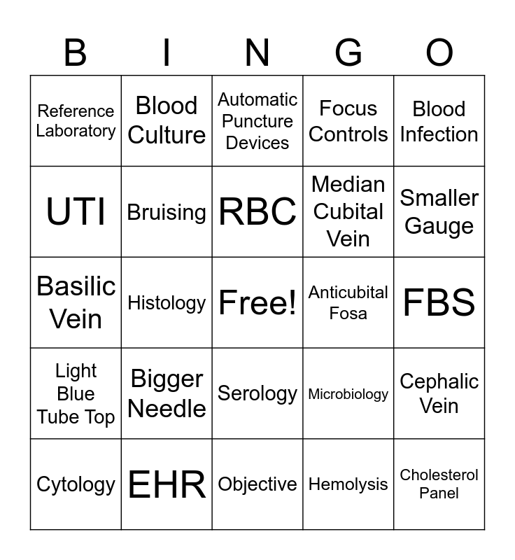 This bingo card has a free space and 24 words: Bigger Needle, EHR, RBC, Cytology, Blood Infection, Reference Laboratory, UTI, Blood Culture, Anticubital Fosa, Serology, Median Cubital Vein, Basilic Vein, Microbiology, Cephalic Vein, Bruising, Hemolysis, FBS, Automatic Puncture Devices, Smaller Gauge, Histology, Cholesterol Panel, Light Blue Tube Top, Focus Controls and Objective.