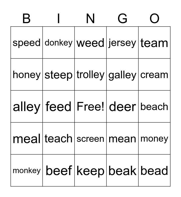 This bingo card has a free space and 30 words: beef, cheek, feed, green, speed, weed, steep, screen, deer, keep, beach, bead, beak, cheap, cream, lead, mean, meal, teach, team, alley, chimney, donkey, galley, honey, jersey, money, monkey, trolley and valley.