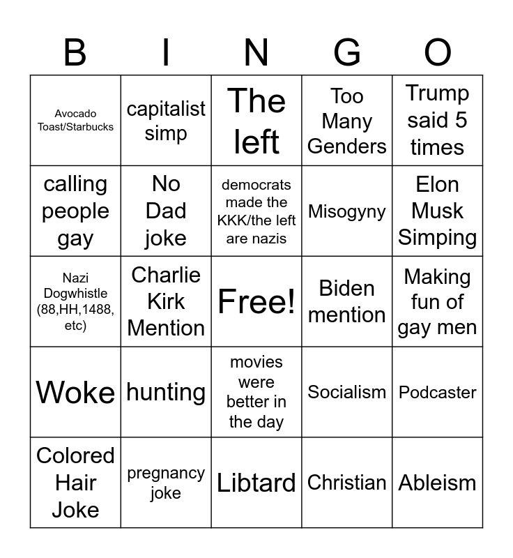 This bingo card has a free space and 56 words: Liberal Used more than 10 Times, Colored Hair Joke, Septum Piercing Joke, Avocado Toast/Starbucks, Libtard, Ai usage, No Dad joke, Rape culture joke, Misogyny, Trans Women, Too Many Genders, Mentally Ill, ICE raid jokes, Joking about cultural food, Indians=stinky, Racism, Trump said 5 times, Charlie Kirk Mention, School shooter joke, Ableism, Biden mention, Communism, Socialism, The left, democrats, democrats made the KKK/the left are nazis, pro-life, Pro-gun, Elon Musk Simping, Soy/Beta Male, Alpha/Omega, 4chan Lingo, Epstein Mention, Fat, Making fun of gay men, calling people gay, Nazi Dogwhistle (88,HH,1488, etc), climate change denial, Woke, capitalist simp, movies were better in the day, games were better back in the day, Sexy=not woke, Ads for (protein, hygiene, or energy, bad shirts), white supremacy, hunting, pregnancy joke, period joke, God Is Good, Making fun of religions, Christian, Violating Flag Code, Proud to be an american, Vaccine, Podcaster and Vaccines.
