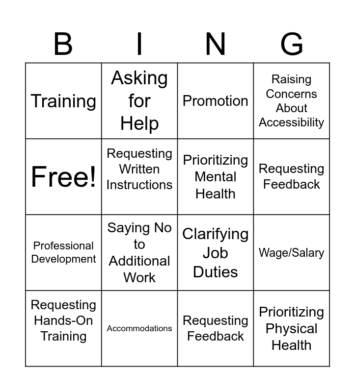 This bingo card has 16 words: Accommodations, Wage/Salary, Promotion, Training, Professional Development, Asking for Help, Clarifying Job Duties, Requesting Feedback, Free!, Requesting Written Instructions, Requesting Hands-On Training, Raising Concerns About Accessibility, Saying No to Additional Work, Requesting Feedback, Prioritizing Mental Health and Prioritizing Physical Health.