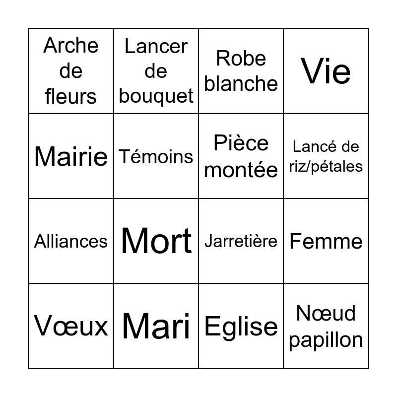 This bingo card has 16 words: Mari, Femme, Robe blanche, Arche de fleurs, Alliances, Lancer de bouquet, Jarretière, Eglise, Mairie, Témoins, Vœux, Vie, Mort, Lancé de riz/pétales, Pièce montée and Nœud papillon.