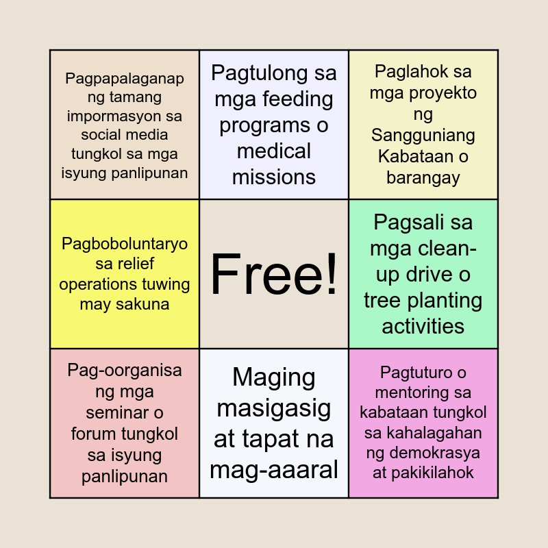 This bingo card has a free space and 8 words: Pagsali sa mga clean-up drive o tree planting activities, Paglahok sa mga proyekto ng Sangguniang Kabataan o barangay, Pagtulong sa mga feeding programs o medical missions, Pag-oorganisa ng mga seminar o forum tungkol sa isyung panlipunan, Pagpapalaganap ng tamang impormasyon sa social media tungkol sa mga isyung panlipunan, Pagtuturo o mentoring sa kabataan tungkol sa kahalagahan ng demokrasya at pakikilahok, Pagboboluntaryo sa relief operations tuwing may sakuna and Maging masigasig at tapat na mag-aaaral.