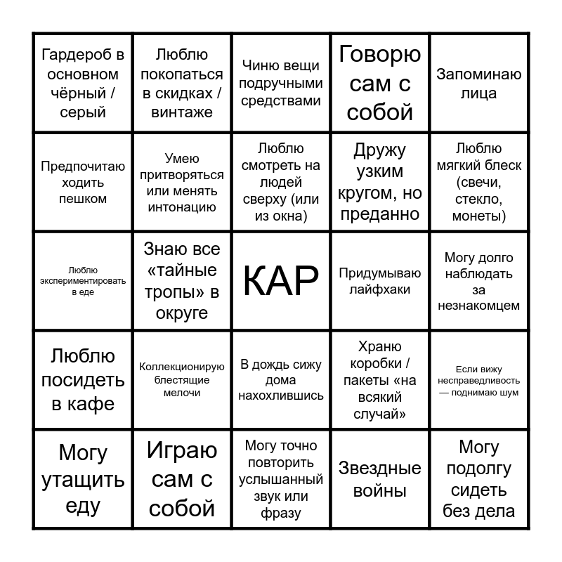 This bingo card has a free space and 25 words: Коллекционирую блестящие мелочи, Могу точно повторить услышанный звук или фразу, Люблю смотреть на людей сверху (или из окна), Могу утащить еду, Запоминаю лица, Гардероб в основном чёрный / серый, Предпочитаю ходить пешком, Люблю покопаться в скидках / винтаже, Придумываю лайфхаки, В дождь сижу дома нахохлившись, Дружу узким кругом, но преданно, Люблю экспериментировать в еде, Храню коробки / пакеты «на всякий случай», Если вижу несправедливость — поднимаю шум, Умею притворяться или менять интонацию, Очень привязан(а) к своему району / месту, Могу долго наблюдать за незнакомцем, Чиню вещи подручными средствами, Люблю мягкий блеск (свечи, стекло, монеты), Знаю все «тайные тропы» в округе, Могу подолгу сидеть без дела, Играю сам с собой, Люблю посидеть в кафе, Говорю сам с собой and Звездные войны.