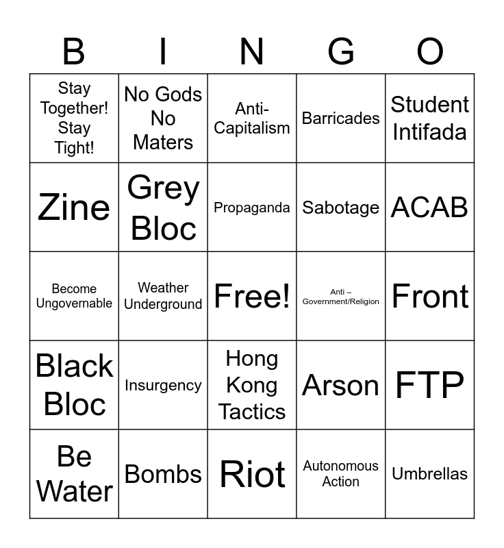 This bingo card has a free space and 34 words: Au Zine Communiqué Weather Underground FTP, Autonomous Action, Affinity Groups, OPSEC, Black Bloc, Grey Bloc, Student Intifada, Be Water, No Gods No Maters, No Borders, Propaganda, Anti- Capitalism, Anti – Industrialization, Anti- Law Enforcement, Anti – Government/Religion, ACAB, Bombs, Become Ungovernable, Insurgency, Arson, Hong Kong Tactics, Tactical, Stay Together! Stay Tight!, Front, Riot, Umbrellas, Barricades, Vandalism, Sabotage, Zine, Communiqué, Weather Underground, FTP and Black Cat.