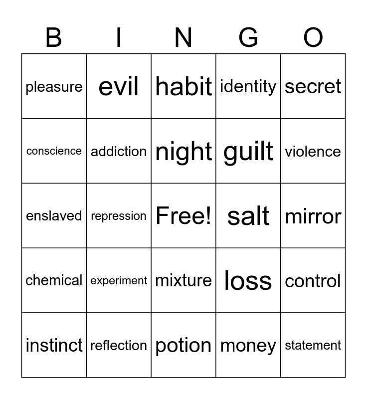 This bingo card has a free space and 46 words: smaller, statement, transformation, potion, experiment, duality, evil, virtue, conscience, temptation, addiction, identity, control, loss, degeneration, hand, night, salt, dread, secret, repression, money, pleasure, guilt, fear, violence, instinct, science, mixture, chemical, dose, tremor, agony, collapse, despair, reflection, mirror, self, other, struggle, will, habit, enslaved, monster, suicide and hand.