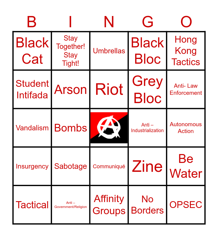 This bingo card has a free space and 33 words: Au Zine Communiqué Weather Underground FTP, ACAB, Bombs, Become Ungovernable, Insurgency, Arson, Hong Kong Tactics, Tactical, Stay Together! Stay Tight!, Front, Riot, Umbrellas, Barricades, Anti- Capitalism, Anti – Industrialization, Anti- Law Enforcement, Anti – Government/Religion, Vandalism, Sabotage, Zine, Communiqué, Weather Underground, Black Cat, Autonomous Action, Affinity Groups, OPSEC, Black Bloc, Grey Bloc, Student Intifada, Be Water, No Gods No Masters, No Borders and Propaganda.