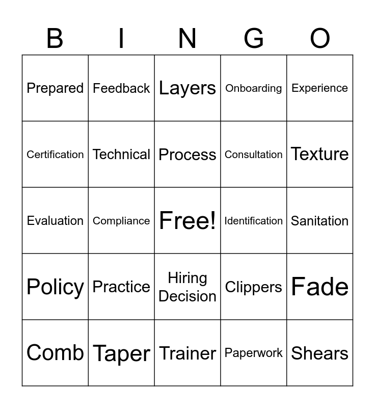This bingo card has a free space and 35 words: Application, Candidate, Interview, Technical, Hiring Decision, Onboarding, Certification, Training, Process, Standards, Evaluation, Experience, Skills, Professionalism, Prepared, Identification, Paperwork, Compliance, Policy, Shears, Clippers, Comb, Fade, Taper, Layers, Texture, Blend, Guidelines, Consultation, Sanitation, Tools, Trainer, Practice, Feedback and Progress.