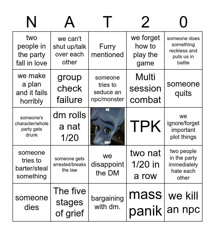 This bingo card has a free space and 24 words: someone gets arrested/breaks the law, The five stages of grief, someone tries to seduce an npc/monster, someone dies, someone does something reckless and puts us in battle, two people in the party fall in love, we make a plan and it fails horribly, we can't shut up/talk over each other, TPK, we disappoint the DM, Multi session combat, someone's character/whole party gets drunk, two nat 1/20 in a row, two people in the party immediately hate each other, group check failure, mass panik, we ignore/forget important plot things, Furry mentioned, someone quits, dm rolls a nat 1/20, we kill an npc, someone tries to barter/steal something, we forget how to play the game and bargaining with dm..