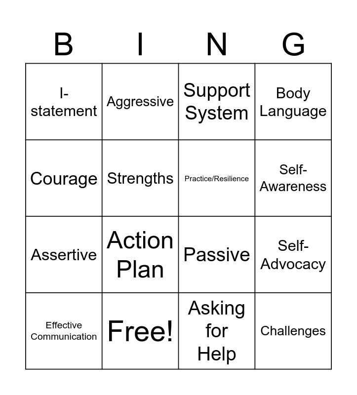 This bingo card has 16 words: Free!, Self-Advocacy, Support System, I-statement, Assertive, Aggressive, Passive, Asking for Help, Courage, Strengths, Effective Communication, Body Language, Action Plan, Self-Awareness, Practice/Resilience and Challenges.