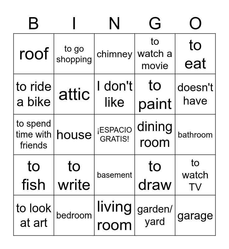 This bingo card has a free space and 30 words: bedroom, kitchen, house, apartment, roof, chimney, attic, basement, dining room, living room, bathroom, garage, garden/ yard, has, doesn't have, to read, to draw, to fish, to write, to eat, to spend time with friends, To play videogames, to go shopping, to paint, to ride a bike, to watch a movie, to watch TV, to look at art, I don't like and I like.
