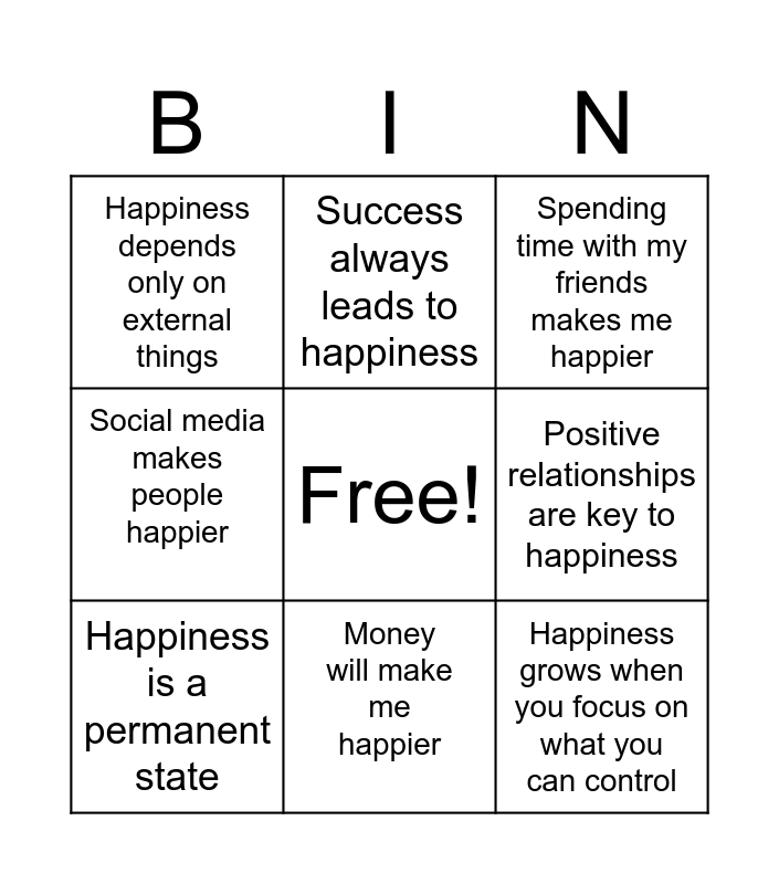 This bingo card has a free space and 8 words: Positive relationships are key to happiness, Spending time with my friends makes me happier, Success always leads to happiness, Happiness is a permanent state, Happiness depends only on external things, Happiness grows when you focus on what you can control, Social media makes people happier and Money will make me happier.