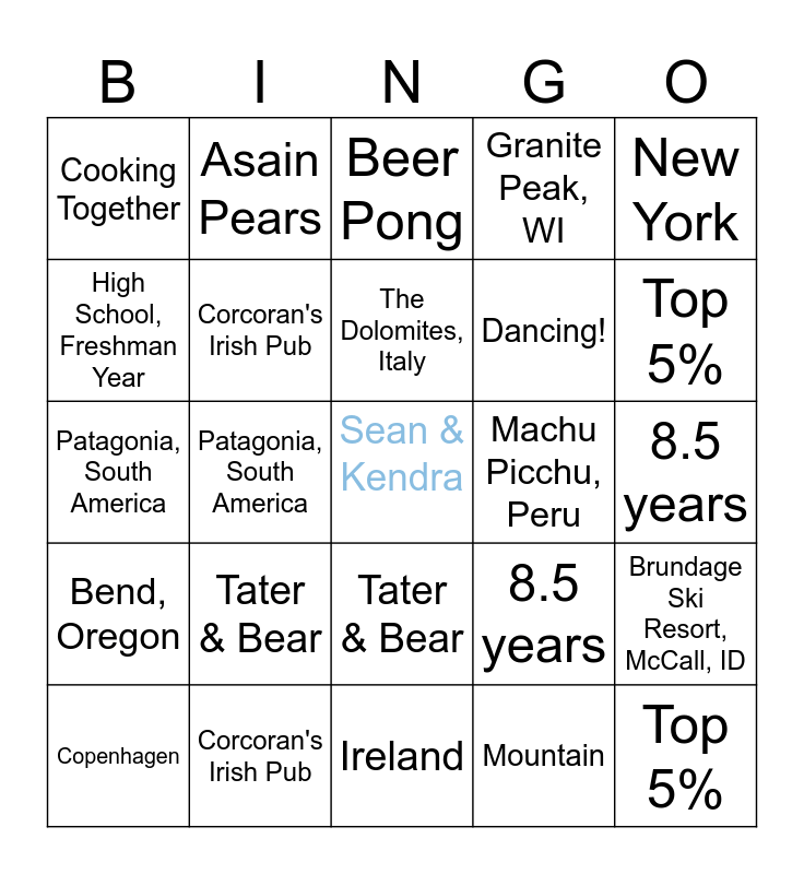 This bingo card has a free space and 48 words: Northside Pool, Top 5%, Copenhagen, Ireland, Tater & Bear, Bend, Oregon, Asain Pears, Float the Boise River, High School, Freshman Year, Kendra, Corcoran's Irish Pub, Granite Peak, WI, Brundage Ski Resort, McCall, ID, 8.5 years, Skiing, Bowling, The Dolomites, Italy, Machu Picchu, Peru, Beer Pong, New York, Patagonia, South America, Mountain, Cooking Together, Dancing!, Northside Pool, Top 5%, Copenhagen, Ireland, Tater & Bear, Bend, Oregon, Asian Pears, Float the Boise River, High School, Freshman Year, Kendra, Corcoran's Irish Pub, Granite Peak, WI, Brundage Ski Resort, McCall, ID, 8.5 years, Skiing, Bowling, The Dolomites, Italy, Machu Picchu, Peru, Beer Pong, New York, Patagonia, South America, Mountain, Cooking Together and Dancing!.