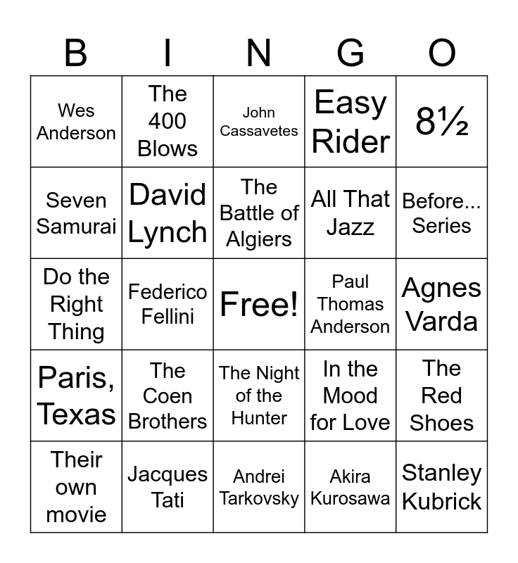 This bingo card has a free space and 29 words: Their own movie, A movie with a family member, Federico Fellini, Ingmar Bergman, Wes Anderson, John Cassavetes, David Lynch, The Coen Brothers, Paul Thomas Anderson, Jacques Tati, Agnes Varda, Stanley Kubrick, Andrei Tarkovsky, Akira Kurosawa, Before... Series, Three Colors Series, The Night of the Hunter, Paris, Texas, 8½, Do the Right Thing, In the Mood for Love, Parasite, All That Jazz, Seven Samurai, Easy Rider, The 400 Blows, The Red Shoes, The Battle of Algiers and 12 Angry Men.