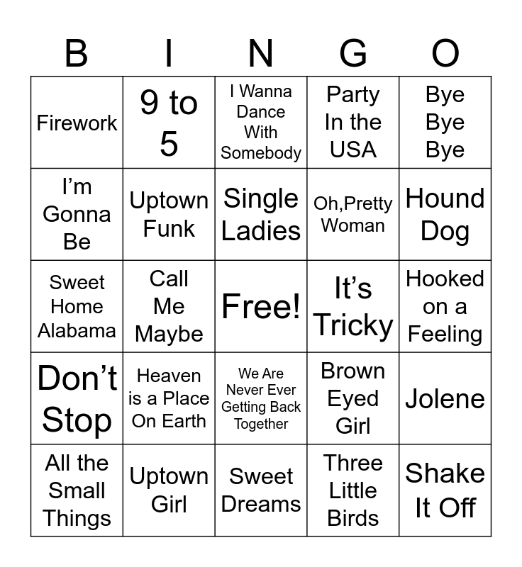 This bingo card has a free space and 77 words: Wannabe, Dancing Queen, I Wanna Dance With Somebody, You’re the One That I Want, All Star, Get the Party Started, Lady Marmalade, Mickey, Everybody, The Fresh Prince of BelAir, Oops! I Did It Again, Never Gonna Give You Up, Single Ladies, I’m Gonna Be, MMMBop, Call Me Maybe, That Don’t Impress Me Much, Shake It Off, Love Shack, Bye Bye Bye, Sweet Caroline, Sweet Home Alabama, Uptown Funk, 9 to 5, Party In the USA, Levitating, Barbie Girl, Girls Just Want to Have Fun, Who Let the Dogs Out, Walking on Sunshine, Ring of Fire, Respect, We Built This City, Brown Eyed Girl, Hound Dog, Oh,Pretty Woman, Señorita, We Will Rock You, Hooked on a Feeling, Three Little Birds, The Middle, I’m Yours, Hips Don’t Lie, Hit Me With Your Best Shot, I Love Rock ‘N Roll, Fight For Your Right, All the Small Things, Firework, I Gotta Feeling, Hey Soul Sister, Since U Been Gone, We Are Never Ever Getting Back Together, Let’s Get Loud, Rockin Robin, Twist and Shout, Hit the Road Jack, Ice Ice Baby, U Can’t Touch This, The Time of My Life, Take On Me, Heaven is a Place On Earth, I’ll Be There For You, Shut Up And Dance, Girl on Fire, Cotton Eye Joe, Dynamite, Best Day of My Life, It’s Tricky, Ain’t No Mountain High Enough, Thunder, Dirt On My Boots, Jolene, Don’t Stop, Uptown Girl, Don’t Stop Believin’, Sweet Dreams and You Give Love a Bad Name.