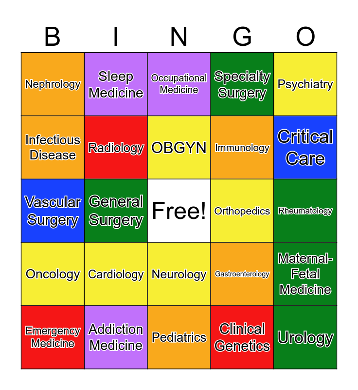 This bingo card has a free space and 39 words: Family Medicine, Anesthesiology, Dermatology, Radiology, Emergency Medicine, Neurology, OBGYN, Ophthalmology, Psychiatry, Oncology, General Surgery, Specialty Surgery, Urology, Rheumatology, Orthopedics, Cardiology, Pulmonology, Nephrology, Otolaryngology, Gastroenterology, Infectious Disease, Pediatrics, Immunology, Critical Care, Endocrinology, Geriatrics, Sports Medicine, Pain Management, Palliative Care, Sleep Medicine, Nuclear Medicine, Preventive Medicine, Occupational Medicine, Addiction Medicine, Clinical Genetics, Reproductive Endocrinology & Infertility, Maternal-Fetal Medicine, Vascular Surgery and Plastic & Reconstructive Surgery.