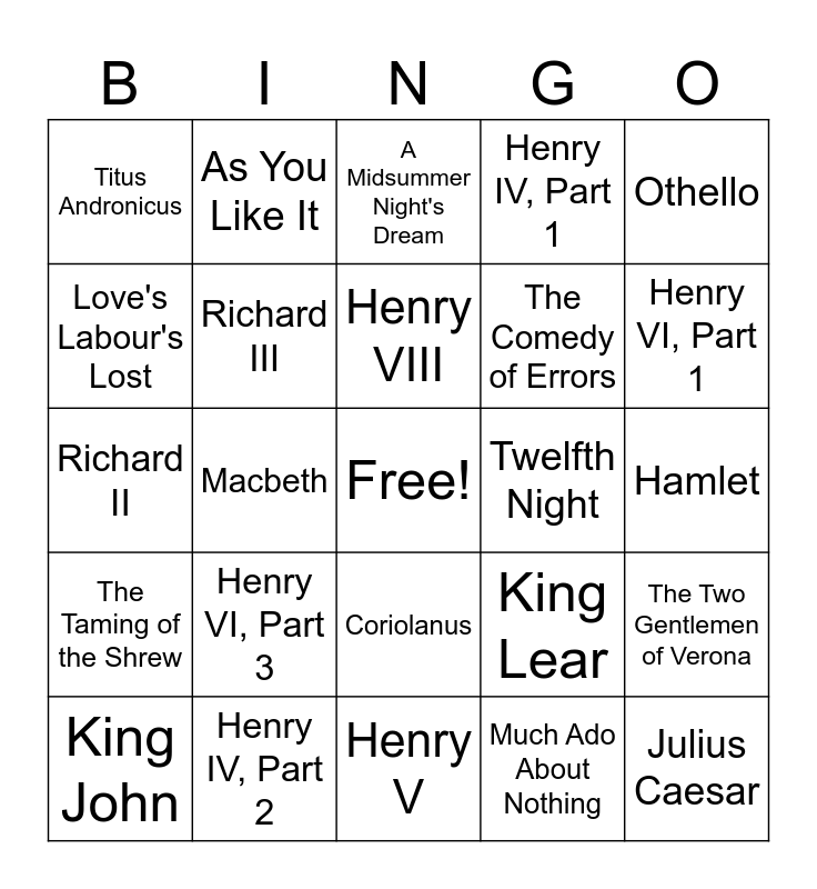 This bingo card has a free space and 28 words: The Two Gentlemen of Verona, The Merry Wives of Windsor, The Comedy of Errors, Much Ado About Nothing, Love's Labour's Lost, A Midsummer Night's Dream, As You Like It, The Taming of the Shrew, Twelfth Night, King John, Richard II, Henry IV, Part 1, Henry IV, Part 2, Henry V, Henry VI, Part 1, Henry VI, Part 2, Henry VI, Part 3, Richard III, Henry VIII, Coriolanus, Titus Andronicus, Romeo and Juliet, Julius Caesar, Macbeth, Hamlet, King Lear, Othello and Antony and Cleopatra.